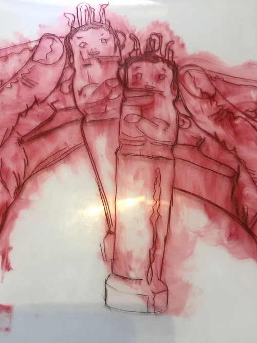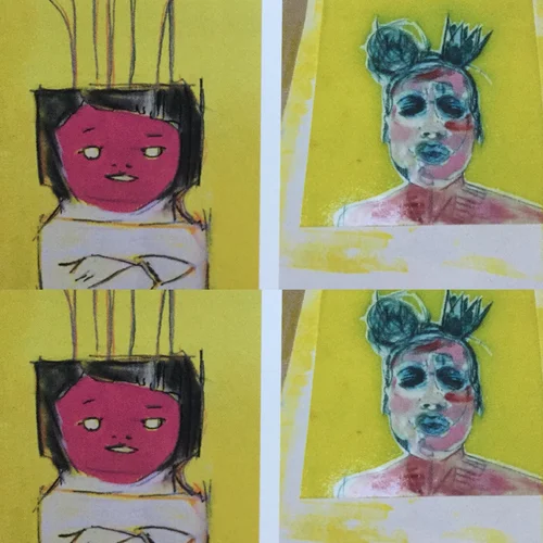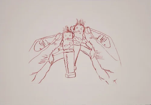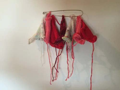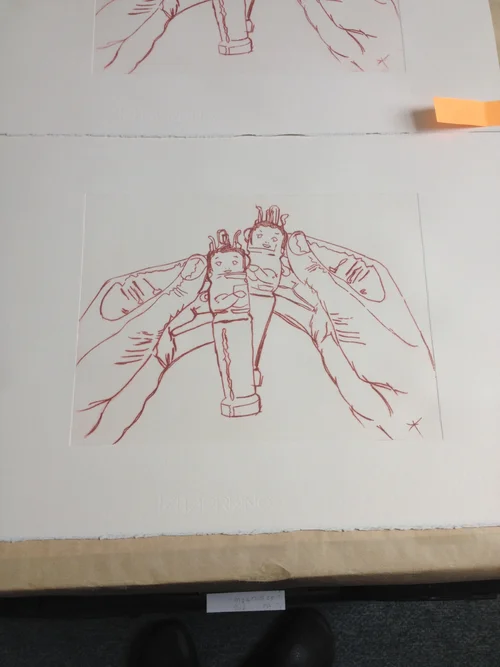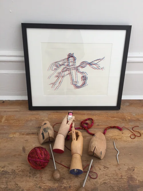 Imagery of knitting dolls and spools mark a transition from Jade's knitted expression back to drawing and printmaking ( 2017 )