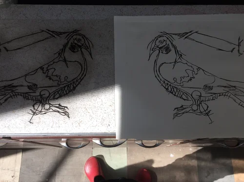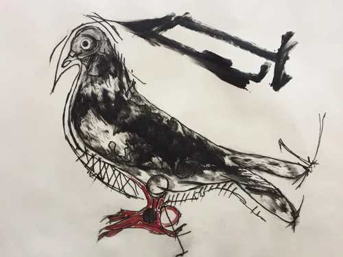 This flight of pigeons with a singular base matrix image are all themselves, finished with ink as a painted monoprint, as no pigeon is alike.