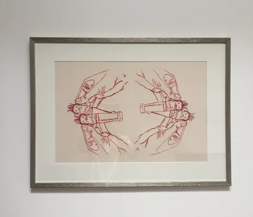 Two Hands Print in Carmine Red on Fabriano Rosa pina