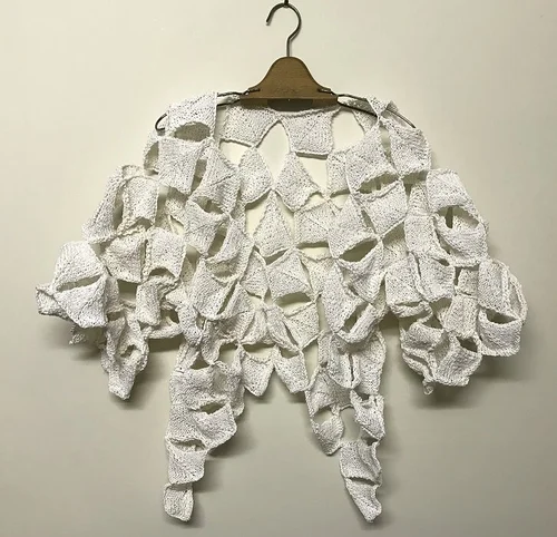 Hand knitted on 4mm bamboo double pointed needles, this Haori jacket constructed from 115 triangle motifs has used close to 1000 metres of white paper string.