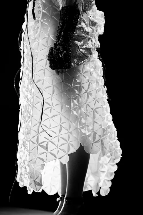 'The Esther Dress' Inspired by the immortal jellyfish, the dress floats through space, utilising the ethereal translucency of trace paper - the jacket and coral-patterned accessories are crocheted from paper string.